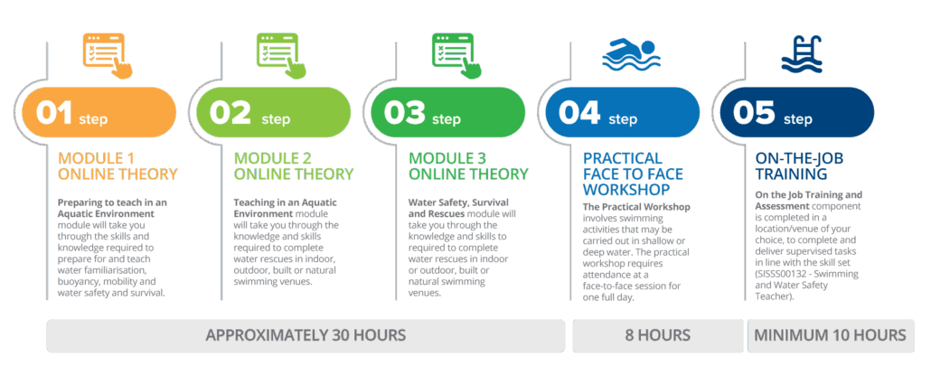 The skill set SISSS00132 – Swimming and Water Safety Teacher provides the skills and knowledge required to assist individuals in gaining the competencies required to deliver water-related personal safety and survival lessons as determined by the federal government.